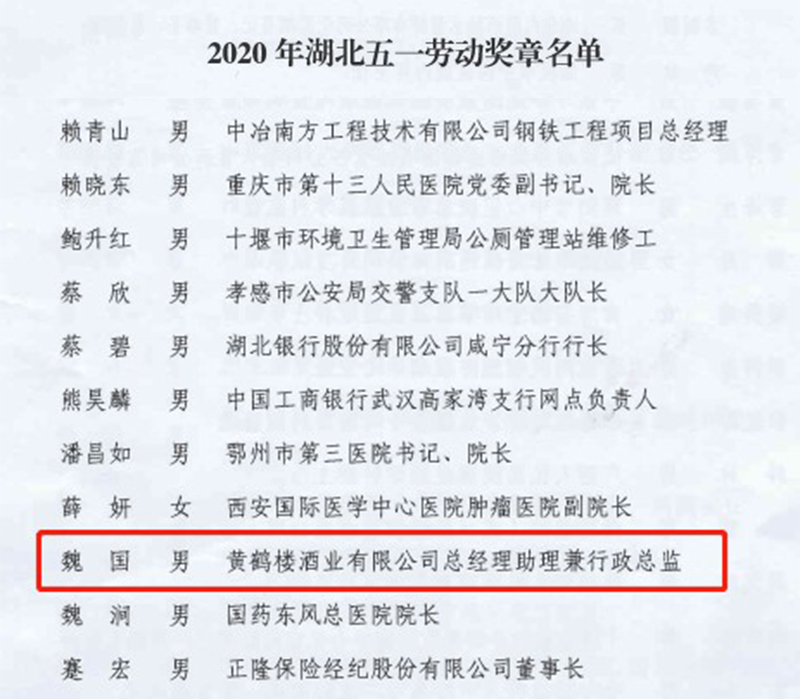 近日,湖北省總工會下發(fā)《關(guān)于表彰2020年湖北五一勞動獎和湖北省工人先鋒號的決定》。黃鶴樓酒業(yè)黨委委員、總經(jīng)理助理魏國被授予湖北五一勞動獎?wù)隆?/p>