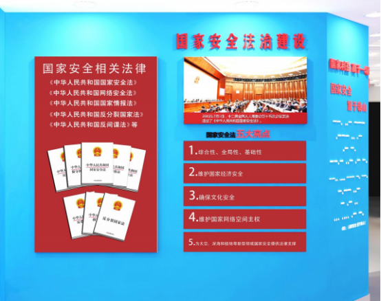 基地陳設(shè)內(nèi)容從“總體國家安全觀”的深刻內(nèi)涵延伸到“身邊的國家安全”,詳細展示了“總體國家安全觀”的誕生、內(nèi)容、體系、制度、法律等,從網(wǎng)絡(luò)、社會、金融、生態(tài)、政治五個方面深入剖析,與每位參觀者息息相關(guān)。最后,從中國共產(chǎn)黨早期的情報保衛(wèi)機構(gòu)在武漢誕生、國家安全大事記的正面引領(lǐng),以及依法打擊間諜和各種危害國家安全非法犯罪活動的反面案例,強化參觀者的國家安全意識。
