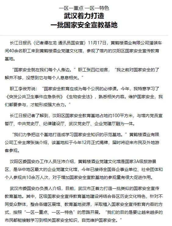 ? ? ? ?近日,黃鶴樓酒業(yè)黨建文化館內(nèi)的漢陽區(qū)國(guó)家安全宣傳教育基地榮登長(zhǎng)江日?qǐng)?bào)。