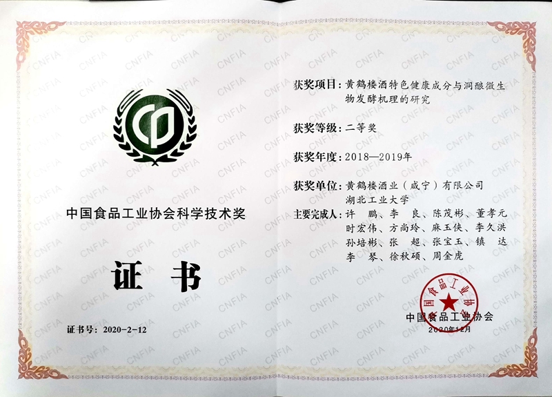 黃鶴樓酒業榮獲“2020年中國食品工業協會科學技術獎”二等獎