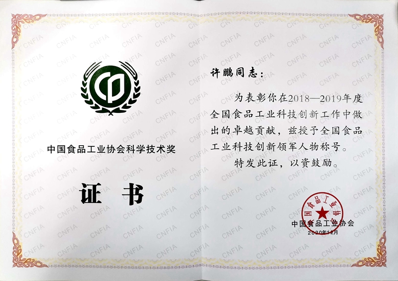許鵬獲“全國食品工業科技創新領軍人物”稱號