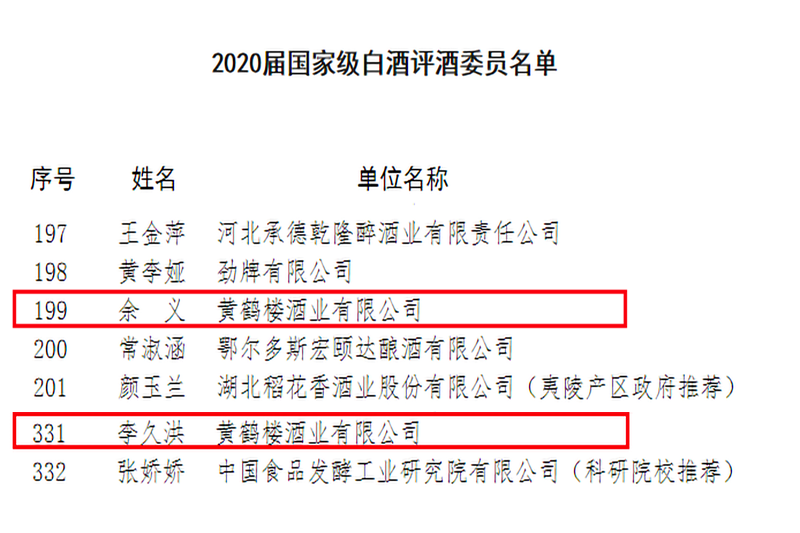 近日,第四屆全國白酒品酒職業(yè)技能競賽結果公布,黃鶴樓酒業(yè)李久洪、余義獲聘為中國酒業(yè)協(xié)會2020屆國家級白酒評酒委員。