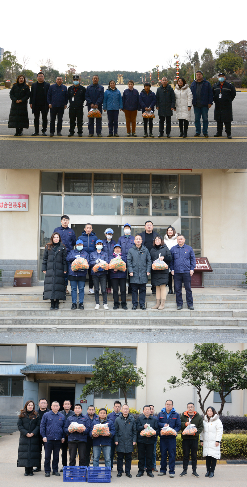 活動中,謝毅一行前往釀造、包裝、勾儲、后勤、保安等一線部門,向工作在一線的員工送去砂糖橘,傳遞企業關愛,并叮囑他們注意保暖保溫,做好防寒安全生產工作,以飽滿的熱情站好2021年的最后一班崗,為保障公司生產、促進產品銷售繼續努力奮斗。