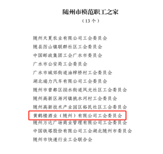 12月26日,黃鶴樓酒業(yè)(隨州)有限公司工會委員會榮獲2023年度隨州市“模范職工之家”榮譽稱號。