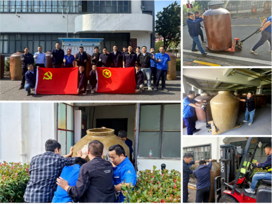 在轉移過程中,面對體型龐大、重量驚人的大陶壇,大家團結協作,采取科學高效的分組分工方式,確保搬運過程安全有序進行。經過數小時的不懈奮戰,33個噸位級大陶壇被順利搬運到廠區指定區域,并進行了景觀設計,為武漢廠區增添了一道亮麗的風景線。