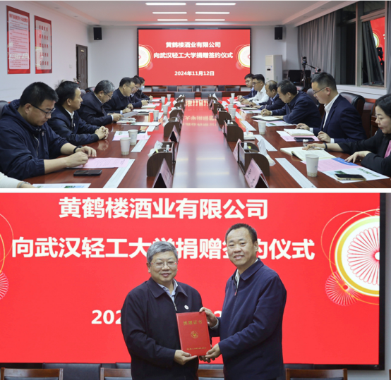 11月12日,黃鶴樓酒業(yè)與武漢輕工大學開展捐贈簽約儀式。武漢輕工大學黨委書記王立兵,黃鶴樓酒業(yè)黨委書記、董事長許鵬出席儀式。